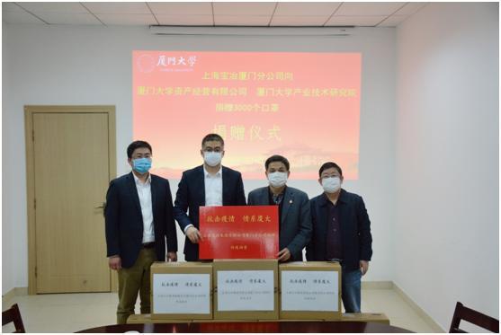3月16日,上海宝冶集团有限公司厦门分公司向资产经营有限公司、产业技术研究院捐赠3000个防疫口罩。捐赠仪式在资产经营有限公司会议室举行,仪式由郑建华书记主持。上海宝冶厦门分公司党委书记、总经理王云高,上海宝冶厦门分公司党委副书记、纪委书记高隽,上海宝冶厦门分公司财务部部长林航,上海宝冶厦门分公司党群工作部部长洪亮,上海宝冶厦门分公司营销中心市场一部部长张伟,厦门大学资产经营有限公司党委书记郑建华,厦门大学资产经营有限公司总经理、厦门大学产业技术研究院院长沈小平,厦门大学资产经营有限公司副总经理杨斌,厦门大学资产经营有限公司副总经理吴福武,厦门大学资产经营有限公司党委副书记刘琪芳,各相关部门负责人及厦门南强建筑工程公司总经理兼党支部书记陈文金,厦门建南环境艺术有限公司、厦门建南文化创意公司总经理兼党支部书记林鸿飞,厦门建南建设监理有限公司总经理兼党支部书记李武等出席了捐赠仪式。