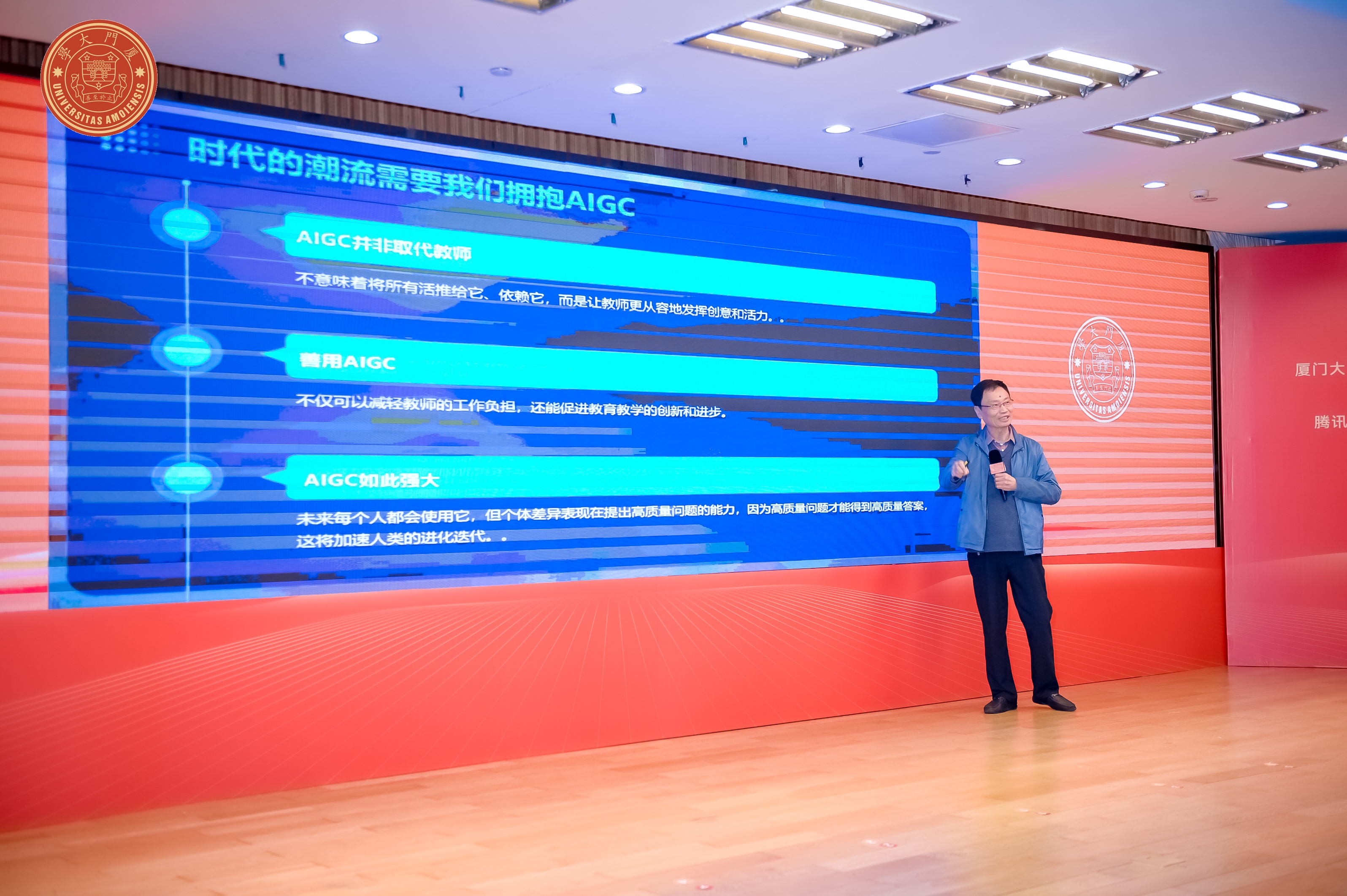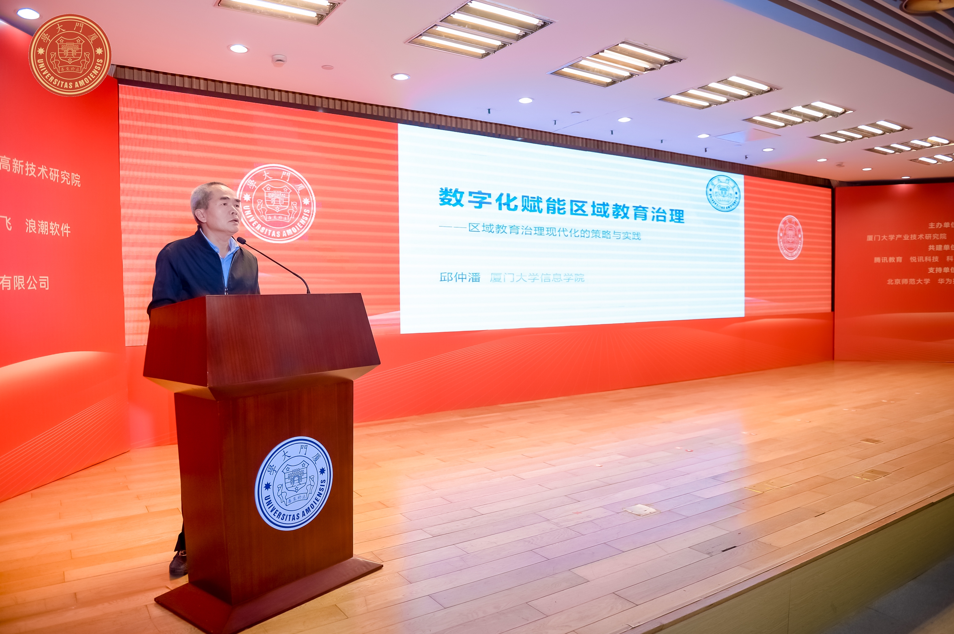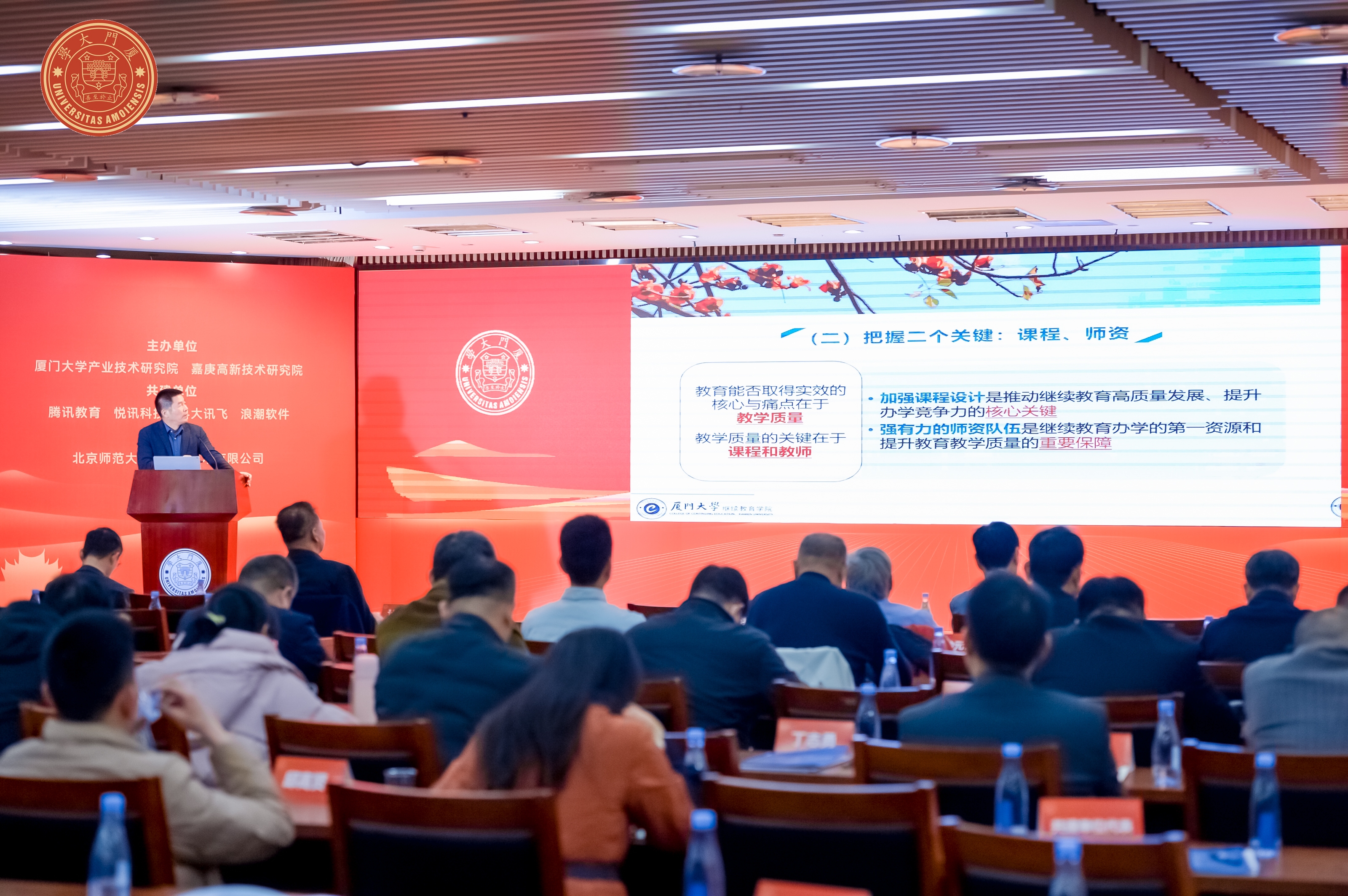 厦门大学继续教育学院院长许和山主持了专家主题分享环节。福建省教育管理信息中心原主任林冬青带来了《生成式人工智能在教育教学中的深化应用》主题分享。厦门大学信息学院副教授邱仲潘带来了《数字化赋能区域教育治理》的主题分享。腾讯基础教育及高等教育总经理饶臻带来了题为《共创未来教育生态,助力人工智能教育应用新场景》的分享,厦门大学继续教育学院院长许和山作了主题为《继续教育的探索与思考》的分享。