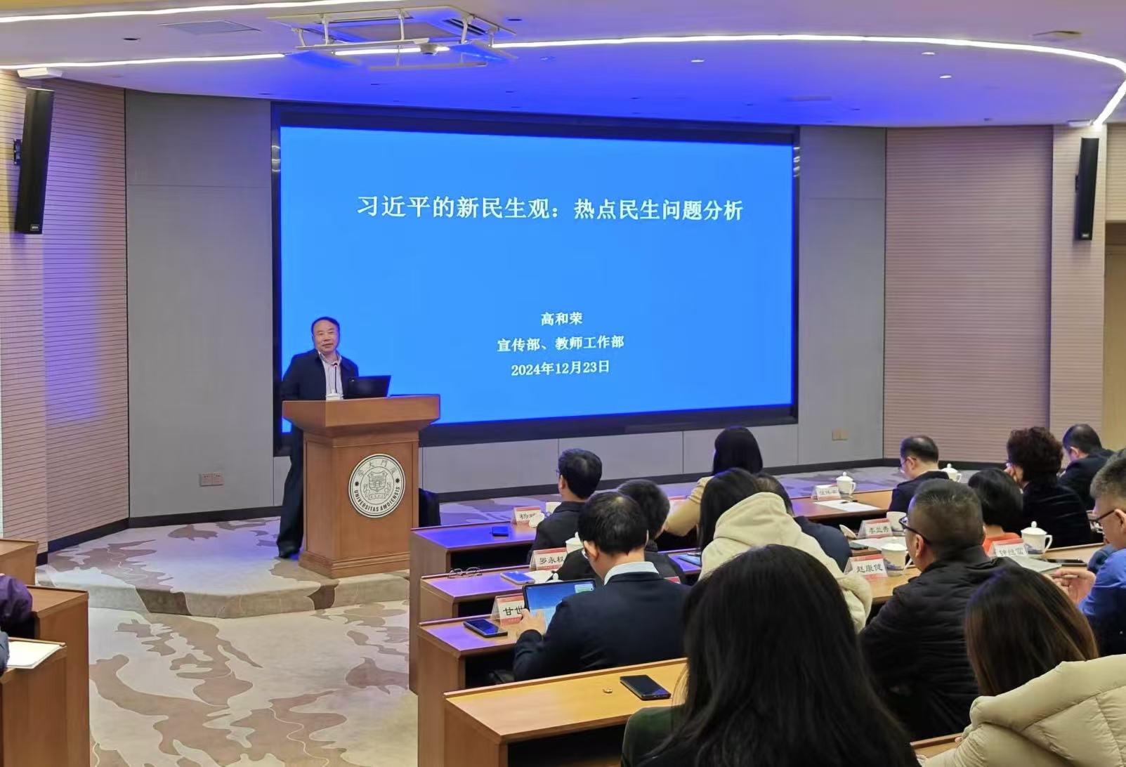 为深入学习贯彻习近平新时代中国特色社会主义思想,深入理解在发展中保障和改善民生的内涵和意义,2024年12月23日下午,资产经营有限公司党委与出版社党总支开展共建联学,邀请校党委常委、宣传部部长、教师工作部部长高和荣教授,作“习近平的新民生观:热点民生问题分析”专题报告。资产经营有限公司党委书记伍伟平、资产经营有限公司总经理兼产业技术研究院院长沈小平,出版社党总支书记张伟、总编施高翔等党政班子成员,全体党员干部参加学习会。会议由伍伟平主持。