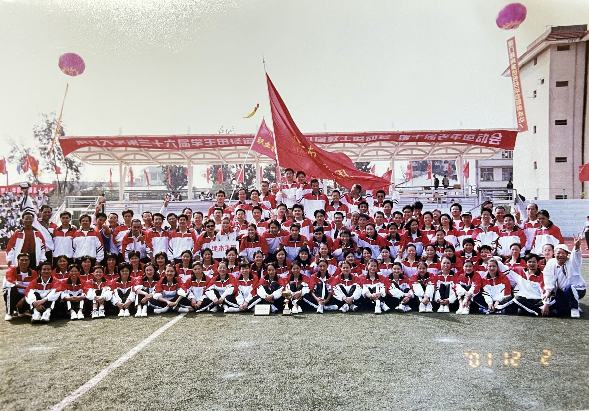 图2. 2001年12月2日,建南集团参加厦门大学第九届教职工运动会(第三排左一为胡继添)