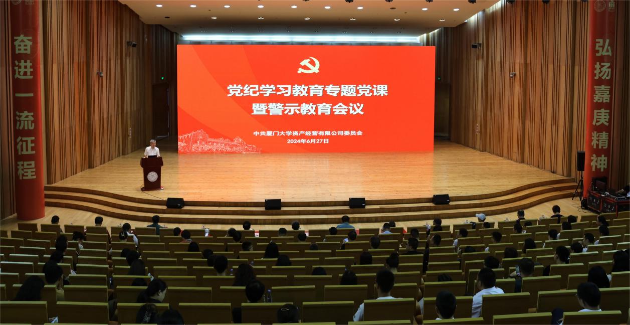 为深入贯彻落实习近平总书记关于党纪学习教育的重要讲话和重要指示精神,认真学习领会《中国共产党纪律处分条例》,强化以案说德、以案说纪、以案说法、以案说责,推动党纪学习教育走深走实,2024年6月27日下午,厦门大学资产经营有限公司(以下简称资产公司)召开党纪学习教育专题党课暨警示教育会议。资产公司党委书记伍伟平、总经理兼产业技术研究院院长沈小平等党委委员,全体在职职工党员、入党积极分子,资产公司部门负责人,所属企业负责人等参加会议。厦门大学基层党建工作联络员谢银辉莅会指导。会议由资产公司党委副书记陈伟主持。