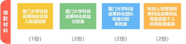 1.技术合同复印件 2.技术合同认定登记证明 3.技术收入核定表(若有) | 1.技术合同复印件 2.厦门大学经费报销单 | 1.厦门大学预借票据申请表 2.技术合同复印件(普票) 3.技术合同认定登记证明(普票) 4.公务卡(专票) |